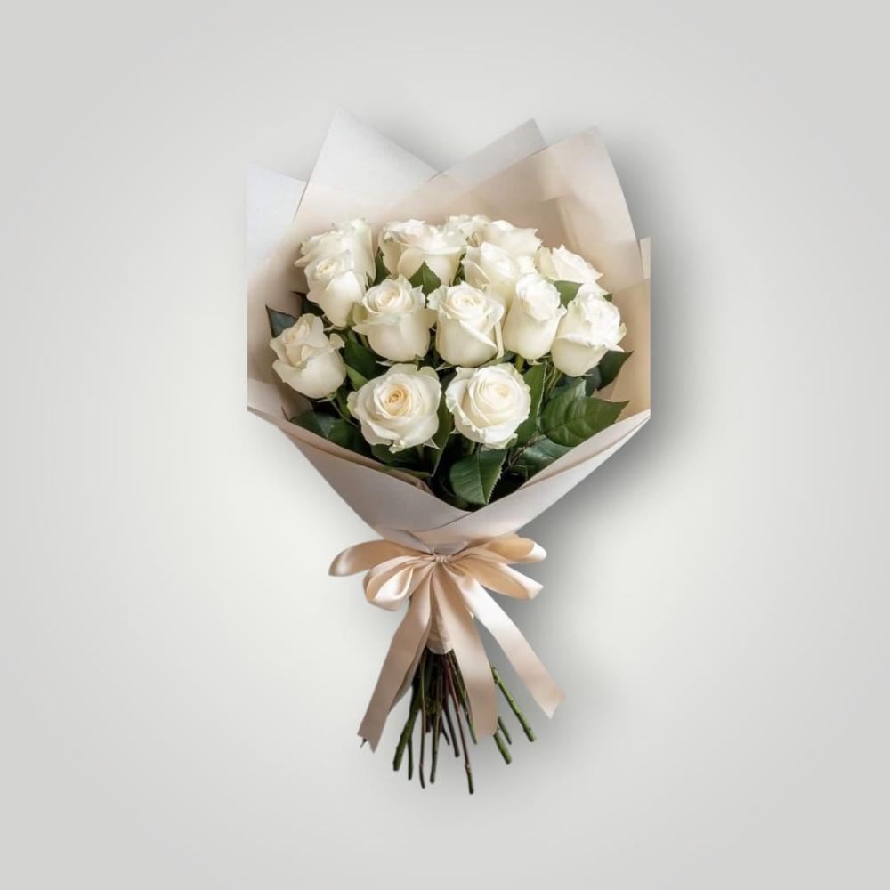 15 adet beyaz gül, yeşillikler ve sade krem tonlarında kraft ambalaj.